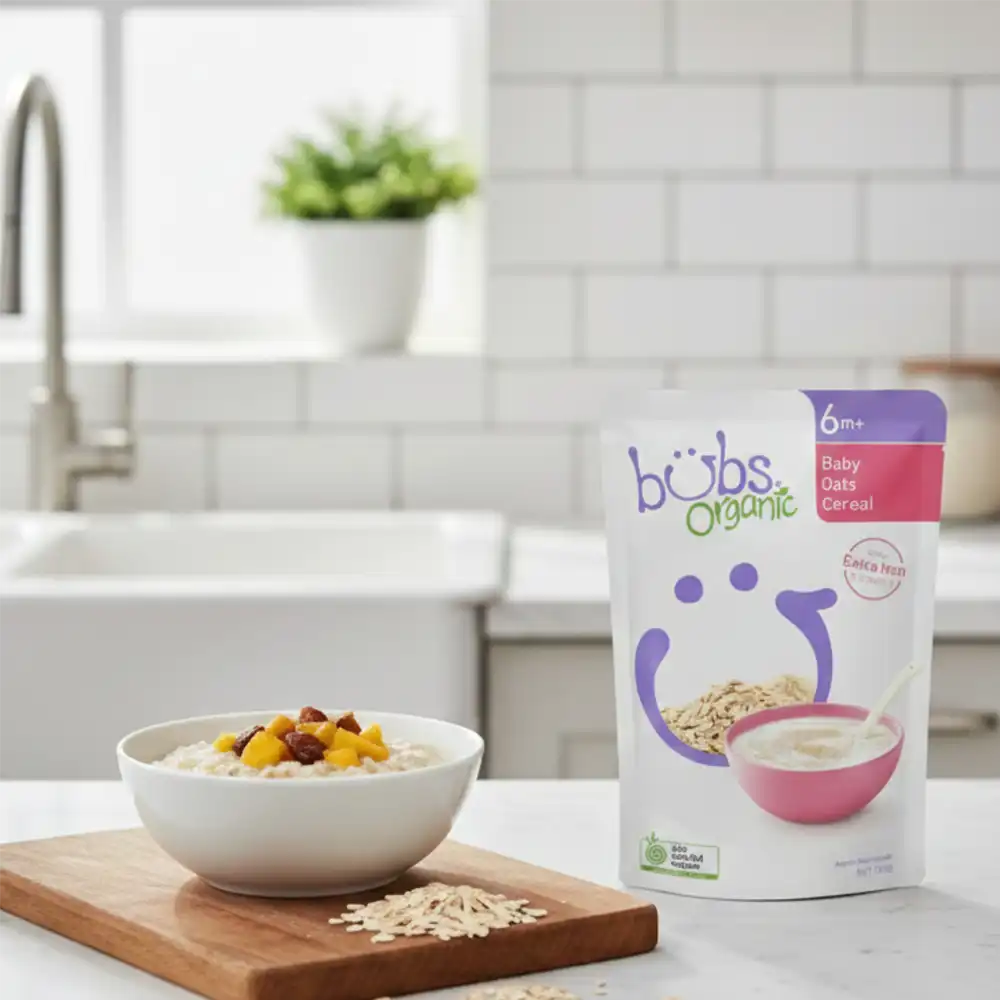 Bubs® Organic Baby Oats Cereal – ১০০% অর্গানিক ওট এবং রাইস ফ্লাওয়ার থেকে তৈরি, হালাল সার্টিফাইড এবং শিশুর জন্য নিরাপদ। ফাইবার, ভিটামিন ও খনিজ সমৃদ্ধ। সহজে হজম হয়, কোন চিনি বা কৃত্রিম সংযোজন নেই।