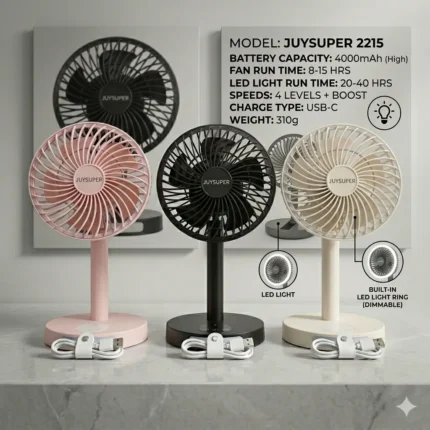 ✔Features: It’s handheld fan that can also be used as a desktop fan with its base, and has a phone holder feature.